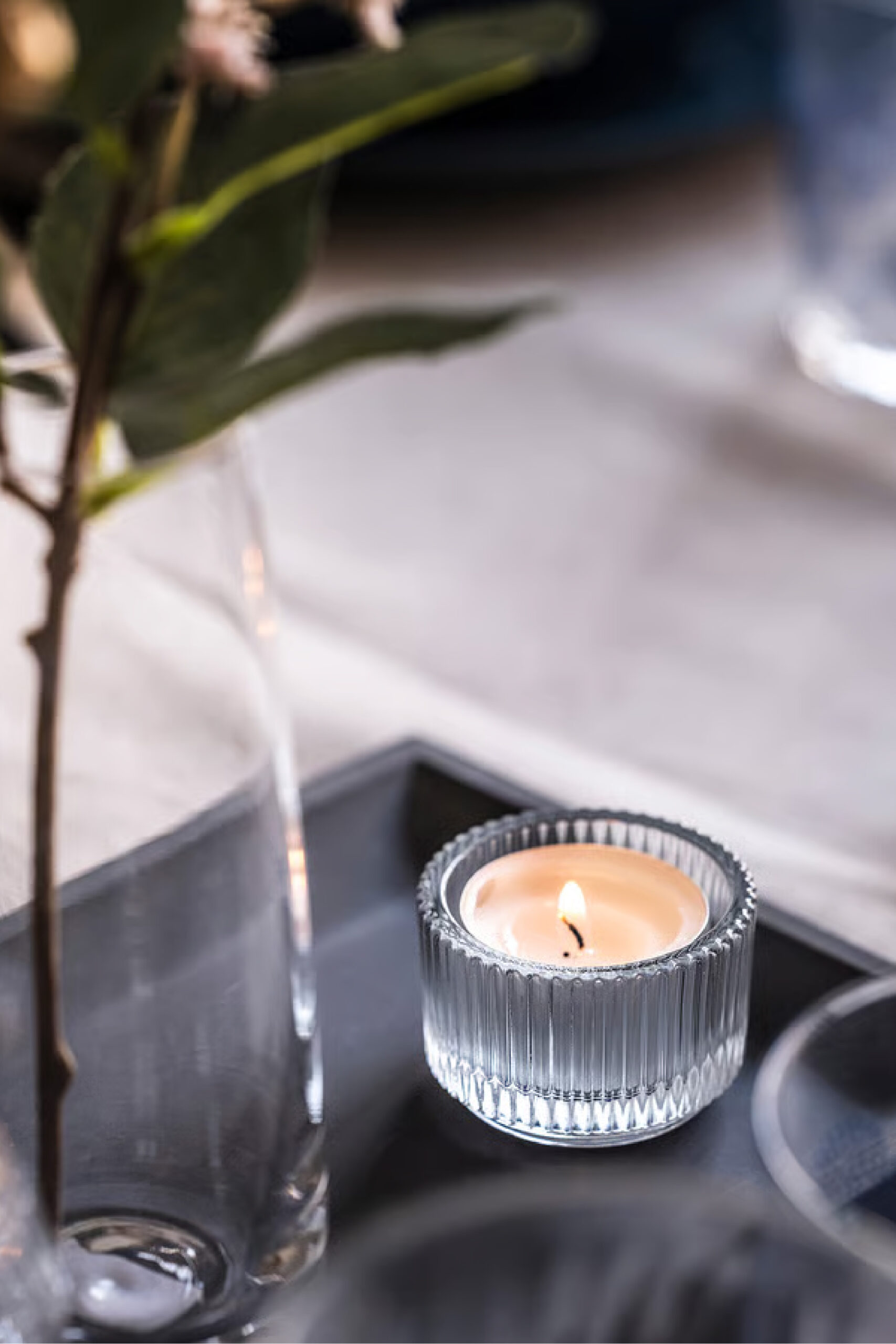 Kleiner Teelichthalter „Schwede“ – mit Riffelung und dezenter Optik für warme Lichtakzente auf Tischen, Buffets oder in Lounge-Bereichen.